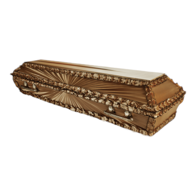 Похоронный аксессуар имеет трапециевидную форму и зауженную книзу базу. Для изготовления использована сосновая доска. Снаружи модель обита атласом или шелком. На боковинах явно просматривается драпировка в виде расходящихся от центра лучей. Верх крышки, низ основания и места стыка отделаны широким рюшем. Четыре металлизированные ручки, покрытые позолотой, установлены для удобства транспортировки. Изнутри обивка из светлой материи. Габариты рассчитаны на усопшего крупных размеров: в длину 1600-2100 мм, в плечах 650-750 мм.