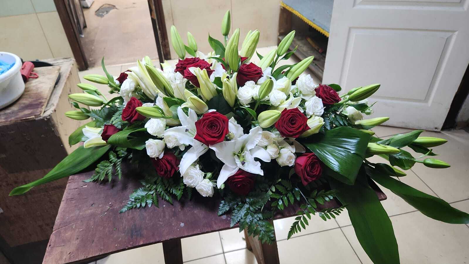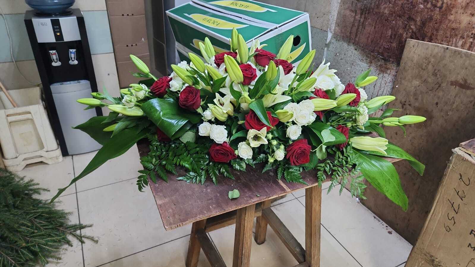 Ритуальная композиция «Элит №2» — это выразительный и уважительный жест памяти, созданный из свежих живых цветов. В основе — насыщенные красные и белые розы, элегантные лилии и натуральная зелень, которые вместе формируют торжественную и глубоко символичную композицию.