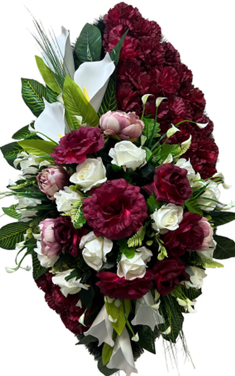 Венок состоит из искусственных цветов, в основном красного и белого цвета. В центре композиции расположена белая роза, окружённая красными цветами, такими как гвоздики и каллы. Дополнительно используются зелёные листья, которые обрамляют венок и добавляют контраста основной цветовой гамме. Венок украшен крупными цветами, что делает его универсальным, но чаще такие венки могут быть более подходящими для мужчин, благодаря строгим цветовым решениям и дизайну.