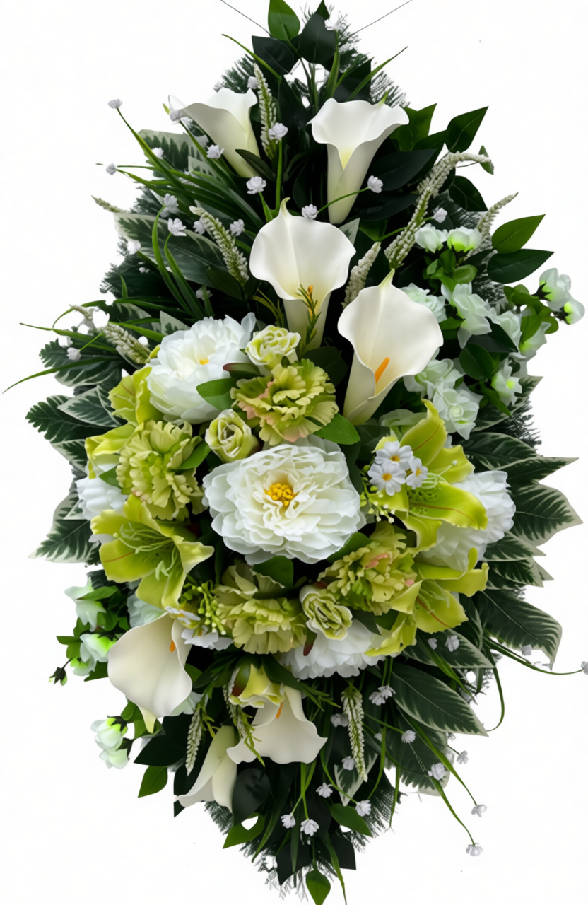 Этот венок подойдёт как для мужчин, так и для женщин, выражая уважение и скорбь через строгие и чистые оттенки, символизирующие вечную память и почтение.