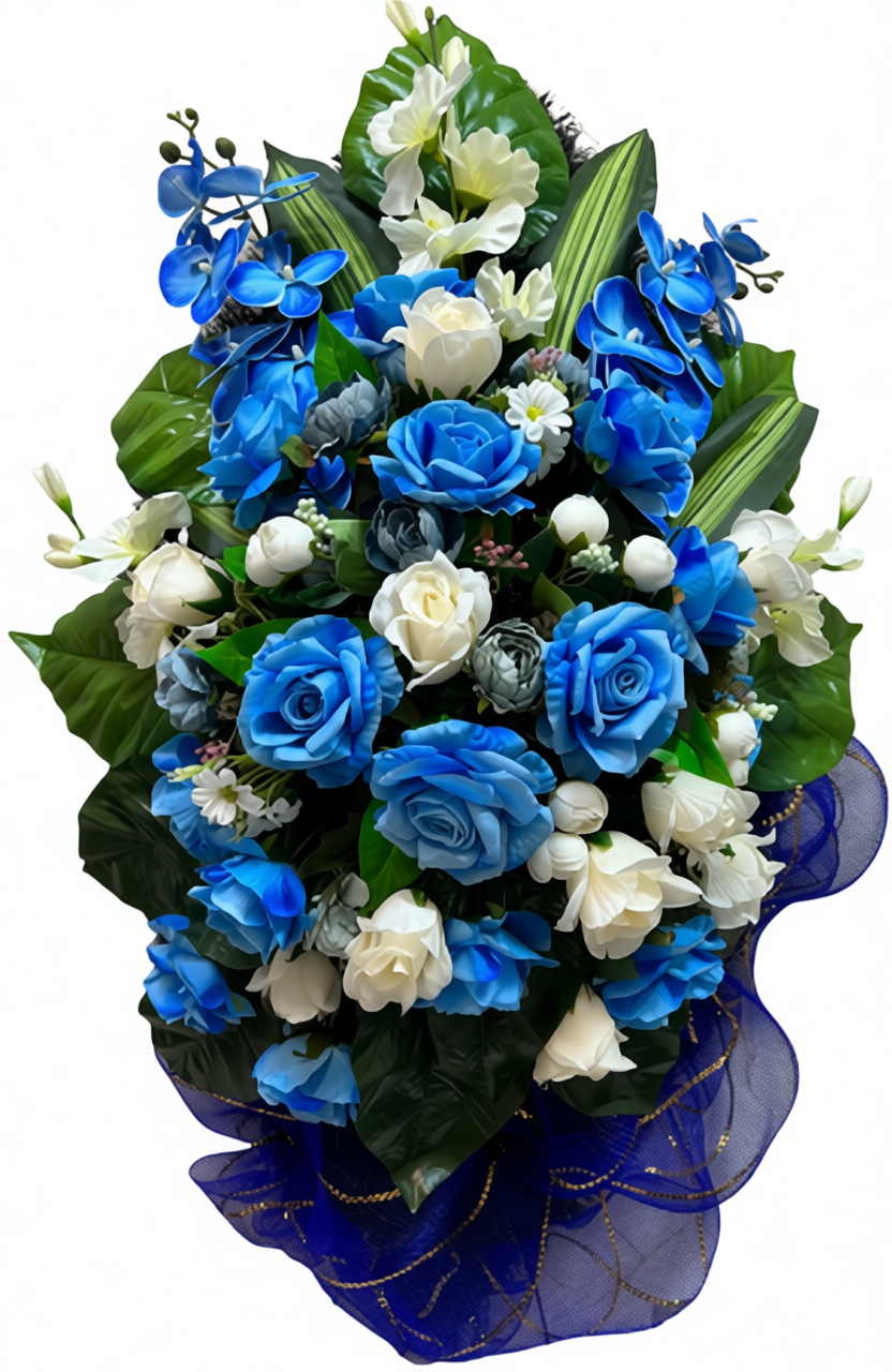 Ритуальный венок элитный №27, высотой 140 см, выполнен в необычной и выразительной синей гамме. В композиции использованы синие розы, ирисы и белые герберы, что создаёт яркий контраст и привлекает внимание. Центральная часть украшена крупными синими цветами, окружёнными зеленью, а по периметру расположены белые цветы, которые придают венку завершённый и гармоничный вид. Оранжевые акценты по краям венка добавляют композиции дополнительную глубину и выразительность.