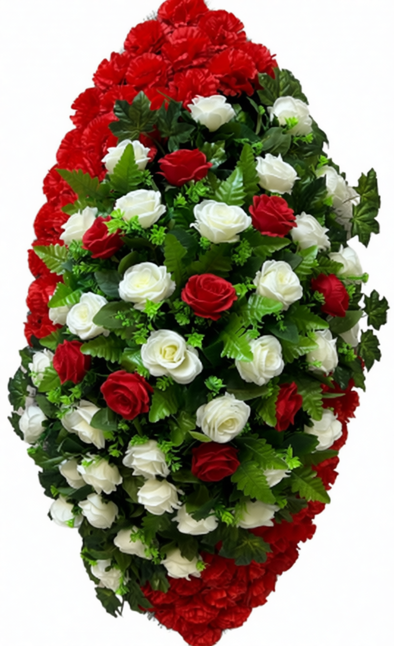 Ритуальный венок высотой 110 см выполнен в классическом стиле, отличающемся насыщенными и глубокими оттенками, что придаёт композиции особую торжественность и выразительность. В его основе лежит гармоничное сочетание крупных искусственных цветов, таких как розы и лилии, с зелёными элементами, символизирующими светлую память и уважение к ушедшему. Венок изготовлен из долговечных материалов, что позволяет сохранить его первоначальный внешний вид на протяжении длительного времени, даже в условиях внешней среды. Этот венок является идеальным выбором для почтения памяти и проведения траурных церемоний, выражая искренние чувства скорби и глубокого уважения к покойному.