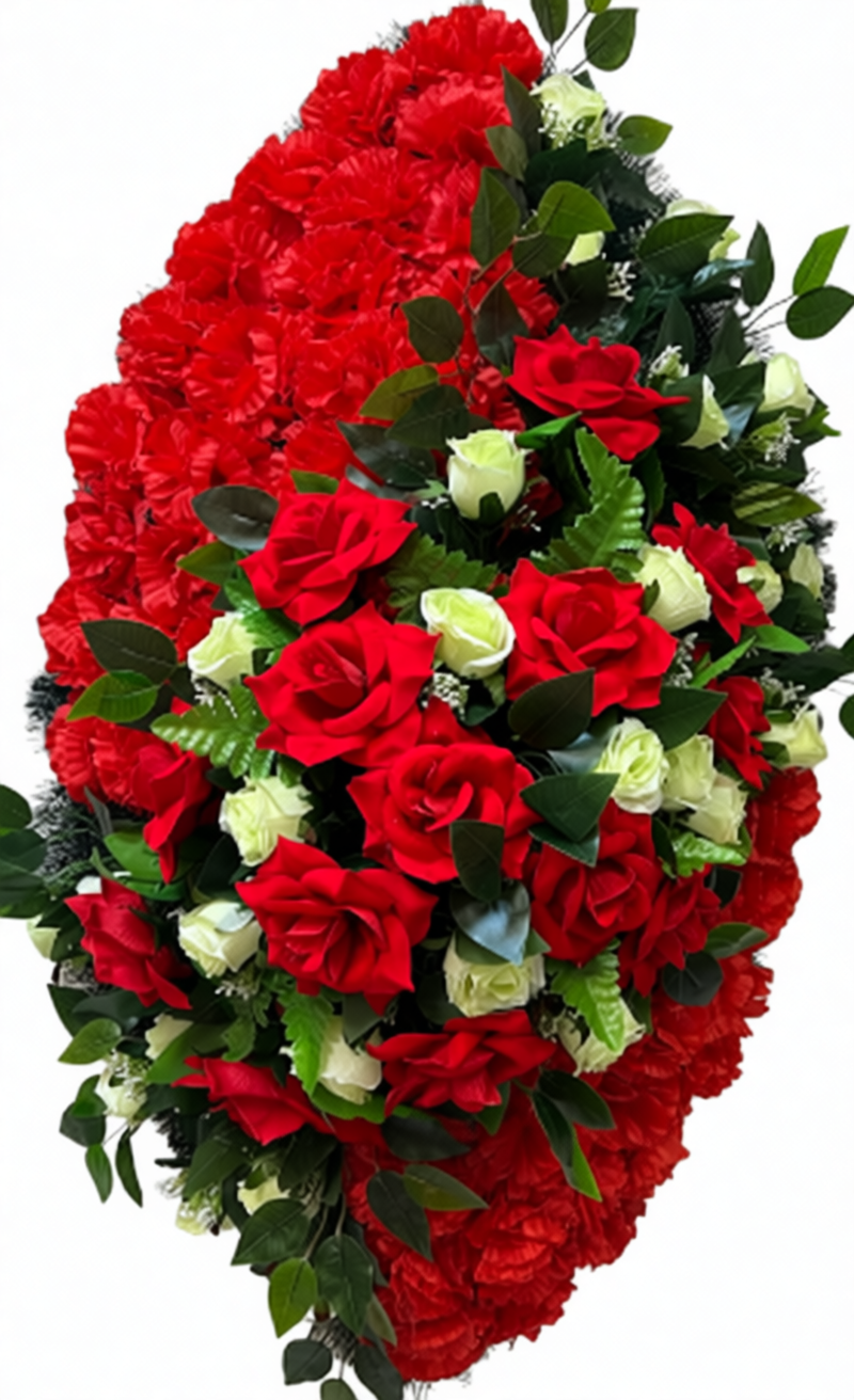 Этот венок выполнен в насыщенной красно-белой гамме, которая символизирует глубокие чувства уважения и памяти. Центральная часть композиции украшена красными розами, символизирующими любовь и скорбь. Белые лилии добавляют венку торжественности и подчёркивают чистоту помыслов. Зелёная листва и декоративные элементы завершают композицию, придавая ей гармонию и объём.