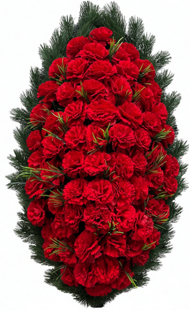 Ритуальный венок элитный №32, высотой 140 см, выполнен в насыщенной красной цветовой гамме, что придаёт ему торжественный и строгий вид. Композиция состоит из крупных алых цветов, таких как розы и лилии, которые аккуратно распределены по всему венку. Вокруг них струятся красные цветочные каскады, создавая ощущение глубины и объёма. Зелёная листва подчёркивает яркость красных цветов и придаёт композиции природную гармонию.