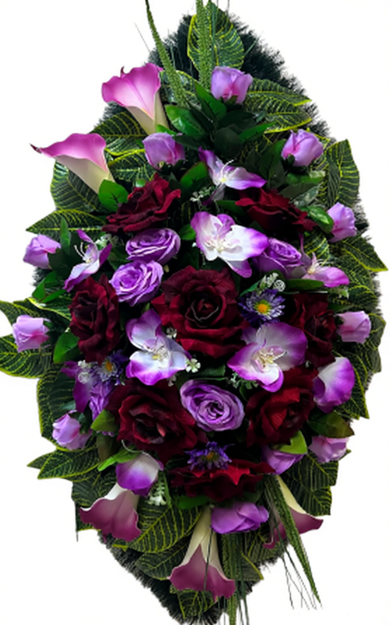Ритуальный венок "Элитный №33" выполнен в нежных лиловых и зелёных оттенках, что придаёт ему утончённый и спокойный вид, идеально подходящий для прощальной церемонии. Основу композиции составляют лиловые розы и другие цветы, которые символизируют любовь, уважение и вечную память о покойном. Эти цветы, с их мягким цветом, создают атмосферу умиротворения и тепла.