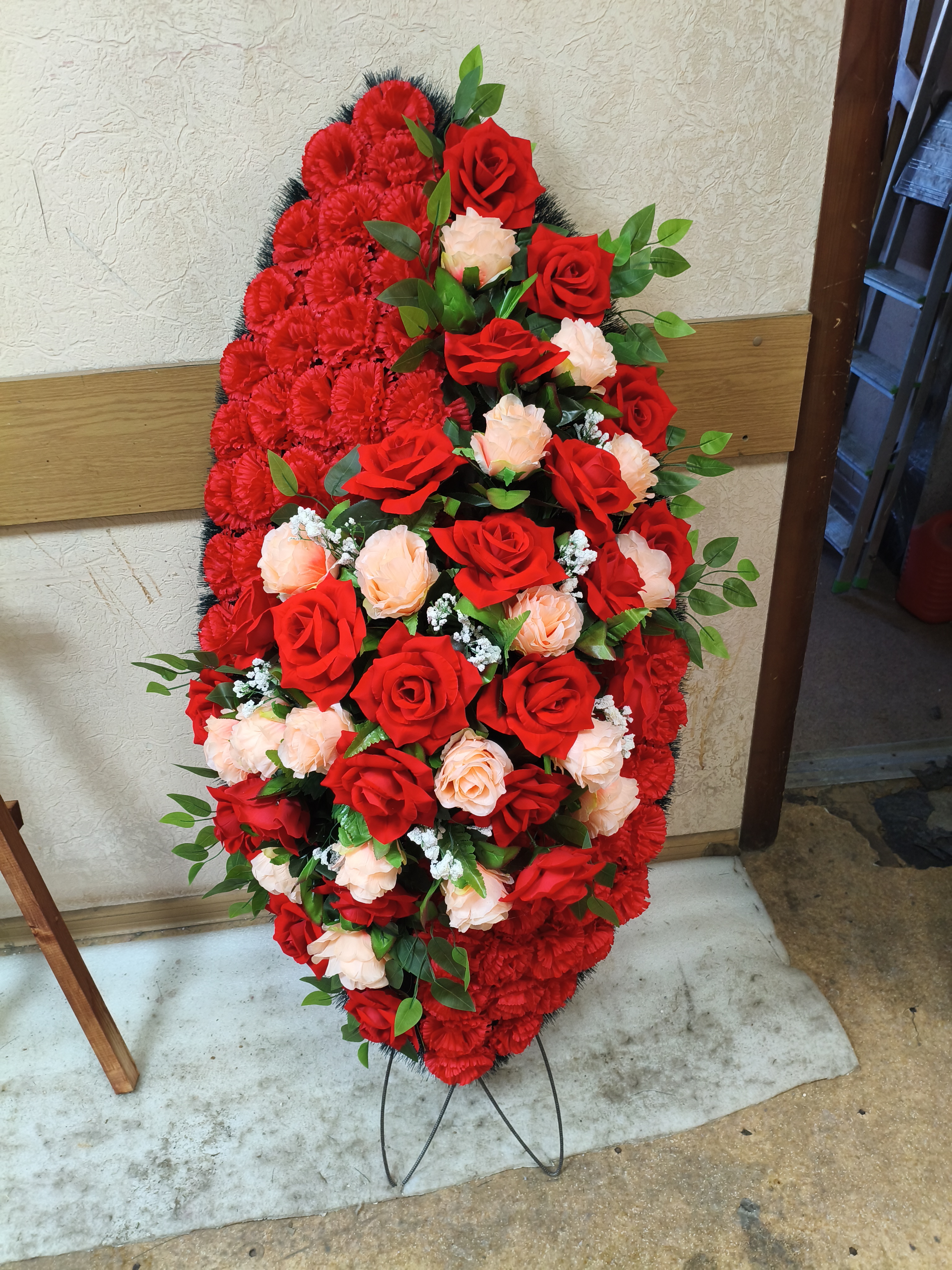 Венок оформлен в контрастной красно-белой цветовой гамме, что символизирует глубокую скорбь и светлую память о покойном. Центральная часть композиции украшена алыми розами и гвоздиками, создающими насыщенный и выразительный фон, который передает уважение и искренние чувства. Нижняя часть венка оформлена белыми розами, символизирующими чистоту и светлую память, что добавляет гармонию и контраст всей композиции. Зелёные листья и декоративные элементы равномерно распределены по венку, подчёркивая глубину и объем цветов. Такое оформление станет достойным выражением уважения и почтения на траурной церемонии, создавая атмосферу, способствующую глубокому размышлению и почтению к ушедшему. Этот венок станет символом любви и памяти, отражая важность момента прощания.