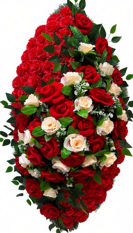 Такой венок подходит как для прощания с мужчинами, так и с женщинами. Красные розы и гвоздики выражают силу чувств и память, в то время как белые розы добавляют светлую, умиротворяющую ноту, что делает его универсальным для траурных церемоний.