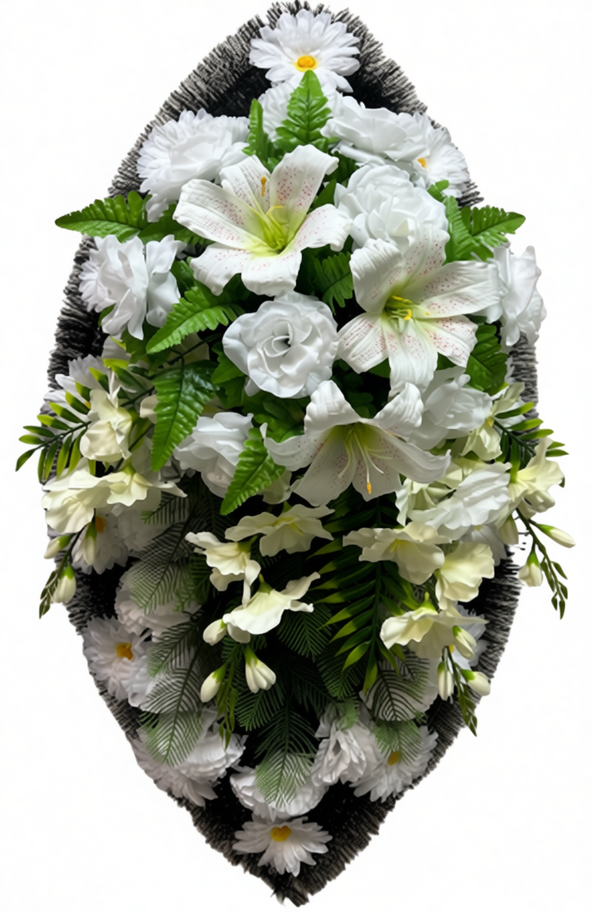 Ритуальный венок, оформленный в контрастных цветах, представляет собой выразительную композицию, в которой доминируют насыщенные красные и чистые белые оттенки. Центральная часть венка украшена крупными красными гвоздиками, символизирующими глубокую любовь, уважение и память о покойном. Вокруг них расположены белые цветы, которые добавляют композиции светлые акценты и создают эффектный контраст, подчёркивая значимость момента прощания.