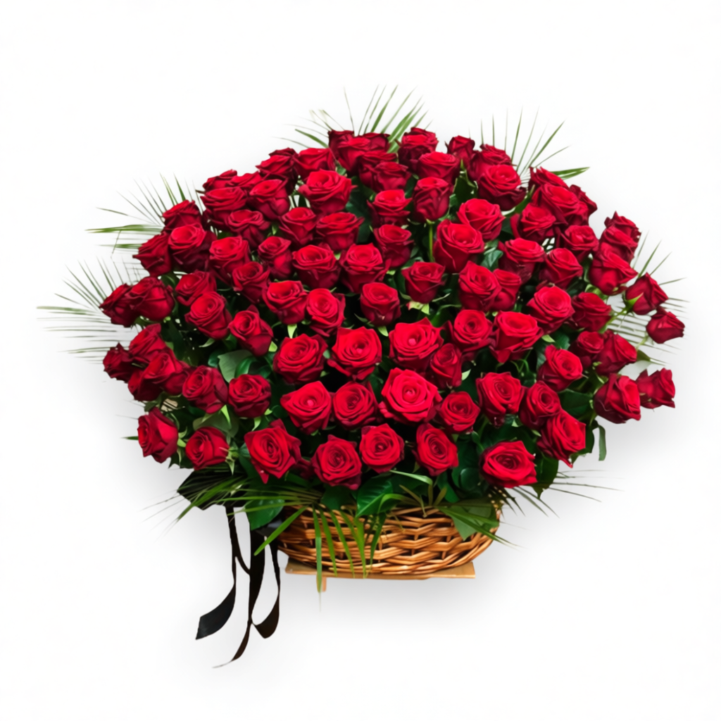 Корзина из 100 красных роз — выражение вечной любви и уважения