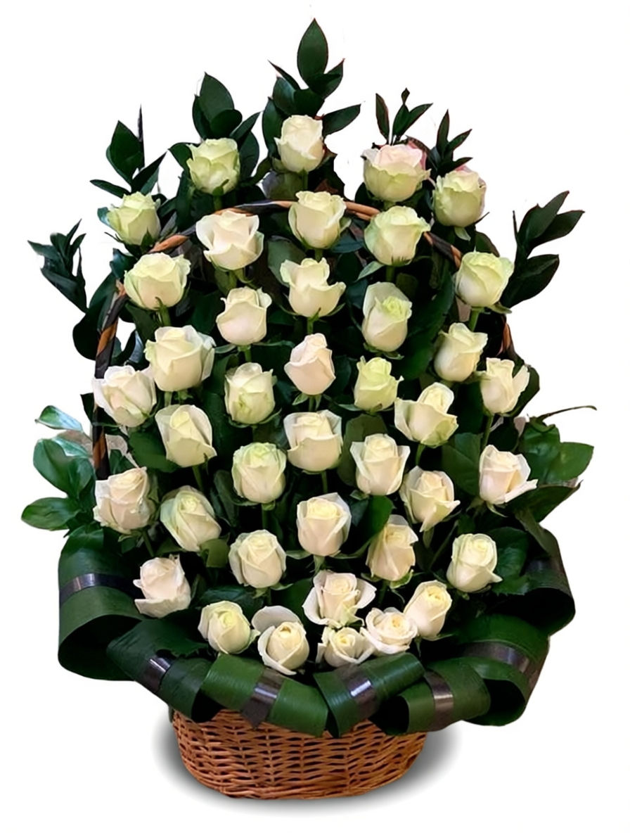 Эта композиция не кричит о потере — она шепчет о любви. Выполненная в форме уютной, плетёной корзины, она наполнена белыми и нежно-кремовыми цветами, словно тёплый свет, оставшийся после ухода человека, который был для вас всем.