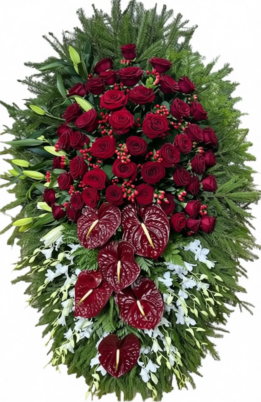Этот траурный венок составлен из ярких красных роз и нежных белых лилий, сочетание которых создаёт выразительный визуальный контраст и передаёт глубокую эмоциональную гамму. Каждый элемент несёт символическое значение, делая композицию особенно значимой в момент прощания.