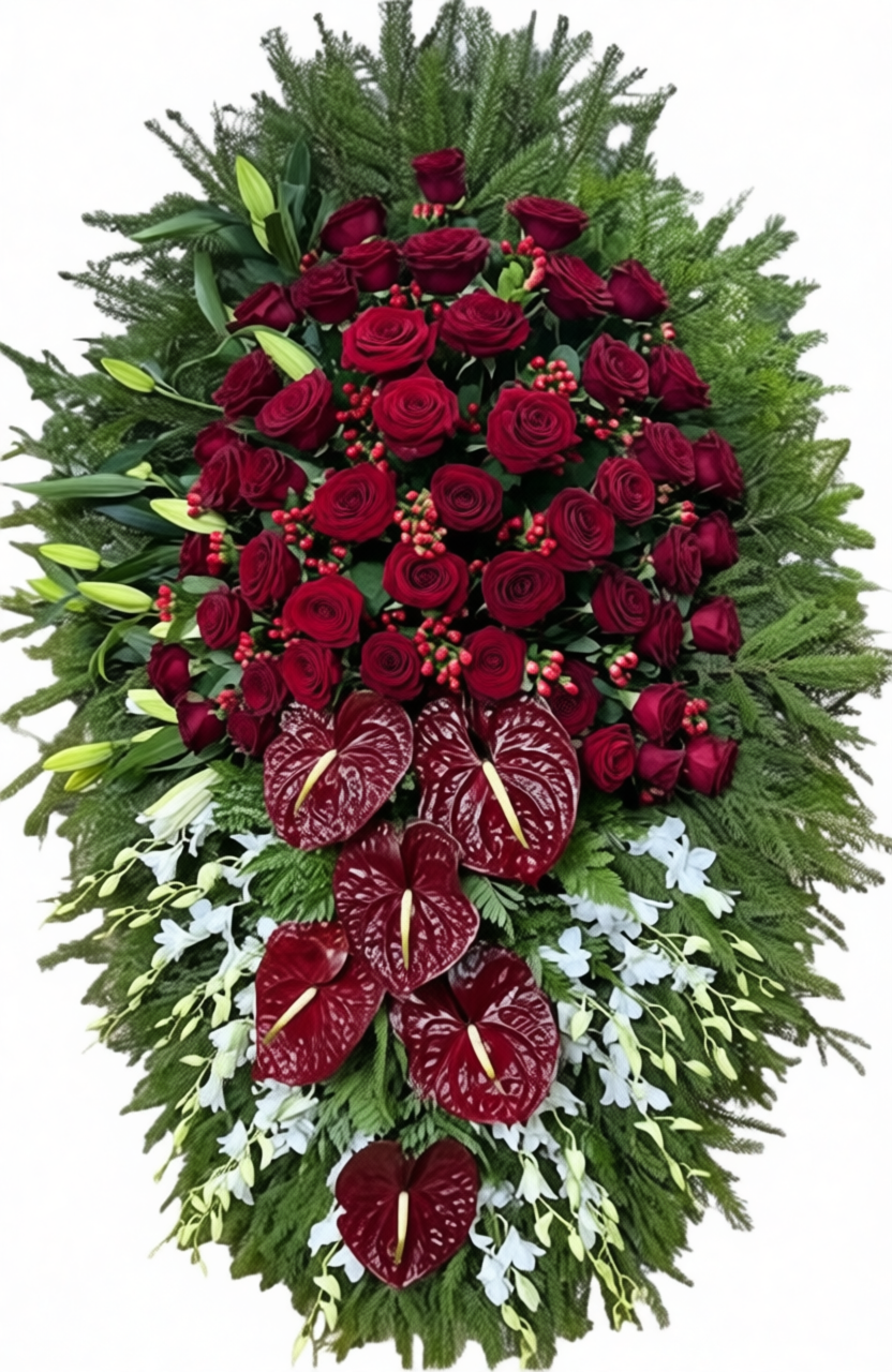 Этот траурный венок высотой 120 см — это элегантная и торжественная композиция, созданная из красных роз, белых хризантем и лилий. Цветовое сочетание передает глубокую любовь, уважение и светлую память об усопшем.