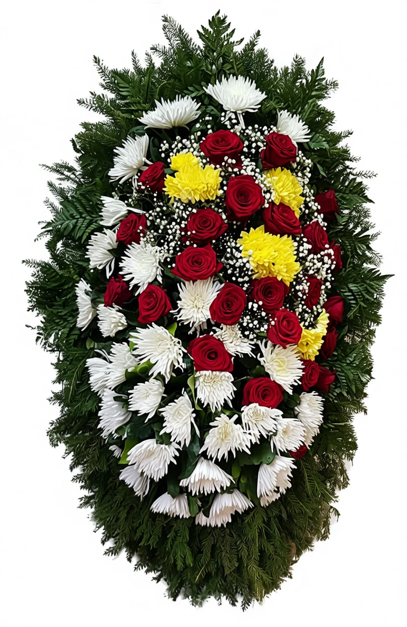 Этот изысканный траурный венок высотой 150 см — сочетание белых и жёлтых хризантем, красных роз и нежной гипсофилы. Он создан как выражение светлой памяти, уважения и глубокой скорби, идеально подходящее для прощальной церемонии.