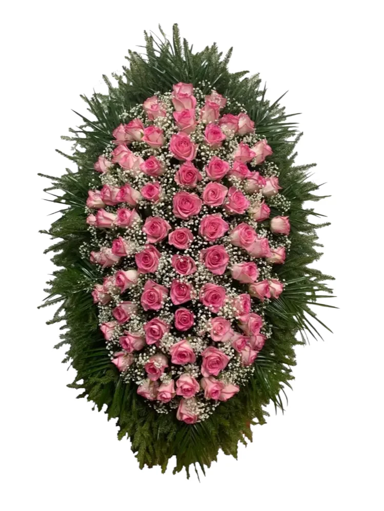 Этот траурный венок высотой 120 см выполнен в нежной и утончённой цветовой гамме, передающей мягкость чувств, светлую памть и искреннюю скорбь. Основу композиции составляют деликатные розовые розы, которые олицетворяют любовь, благодарность и светлое воспоминание.