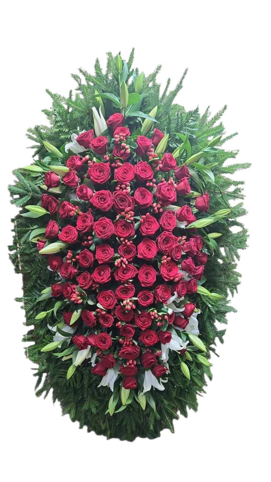 Этот траурный венок создан как знак глубокого уважения, скорби и любви к ушедшему человеку. В основе композиции - красные розы, символизирующие преданную любовь, уважение и страстную преданность памяти усопшего. Их насыщенный цвет придаёт композиции эмоциональную выразительность и торжественность.