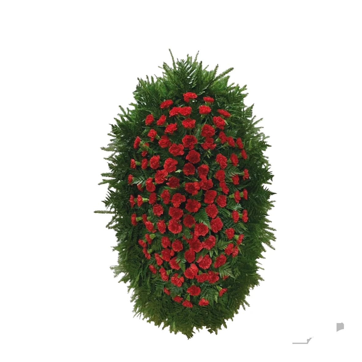 Этот строгий и торжественный траурный венок высотой 150 см создан из красных гвоздик — цветов, олицетворяющих скорбь, уважение и вечную память. Его насыщенный цвет и плотная композиция делают его достойным акцентом на церемонии прощания.