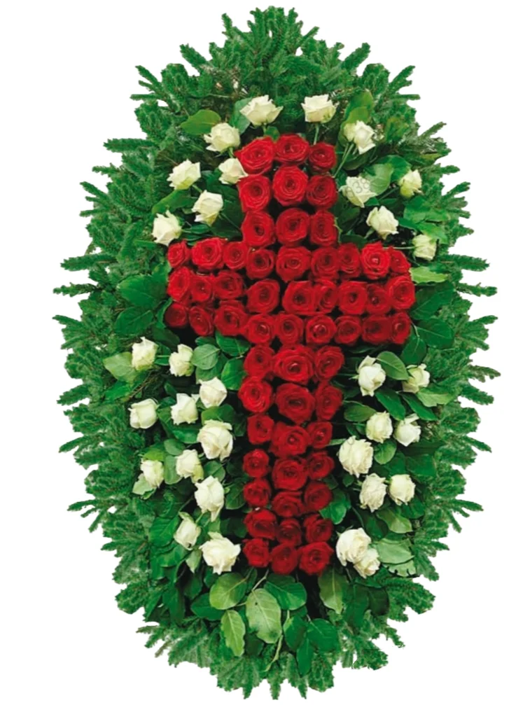 Этот траурный венок выполнен из свежих роз, собранных в форме креста - глубоко символичной и духовной композиции. В центре композиции расположены яркие красные розы, которые образуют крест и олицетворяют веру, жертвенную любовь, вечную жизнь и светлую память об усопшем.