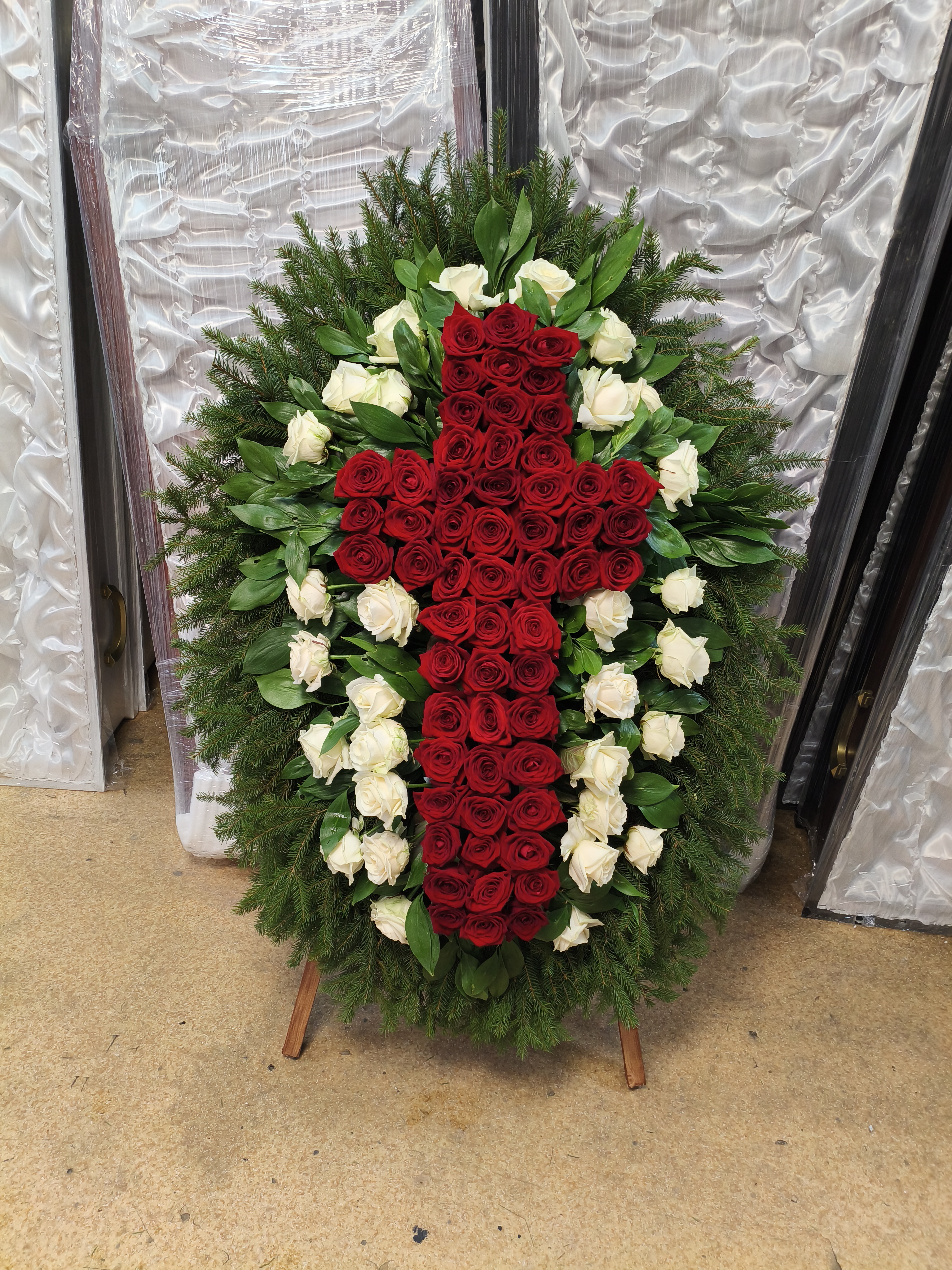 Вокруг креста аккуратно размещены белые розы - символ чистоты помыслов, невинности и духовного просветления. Их нежный оттенок подчёркивает контраст и придаёт венку благородства и строгости.