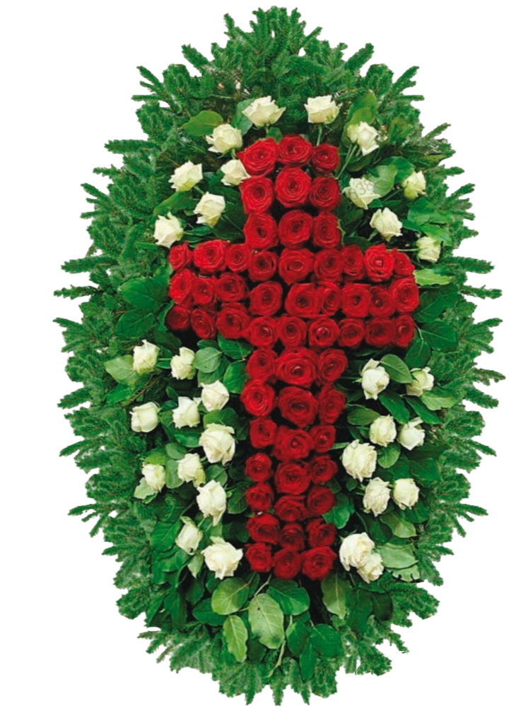 Траурный венок из живых цветов №18 — это строго оформленная траурная композиция высотой 180 см, составленная из красных и белых роз в форме креста. Это мощный символ веры, скорби и уважения, идеально подходящий для церемонии прощания или возложения на могилу.