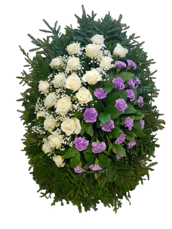 Этот изысканный траурный венок высотой 150 см — сочетание белых роз и сиреневых гвоздик, дополненное зелёными ветвями и нежной гипсофилой. Он создан как символ светлой памяти, уважения и любви к усопшему, передающий глубокие и искренние чувства.