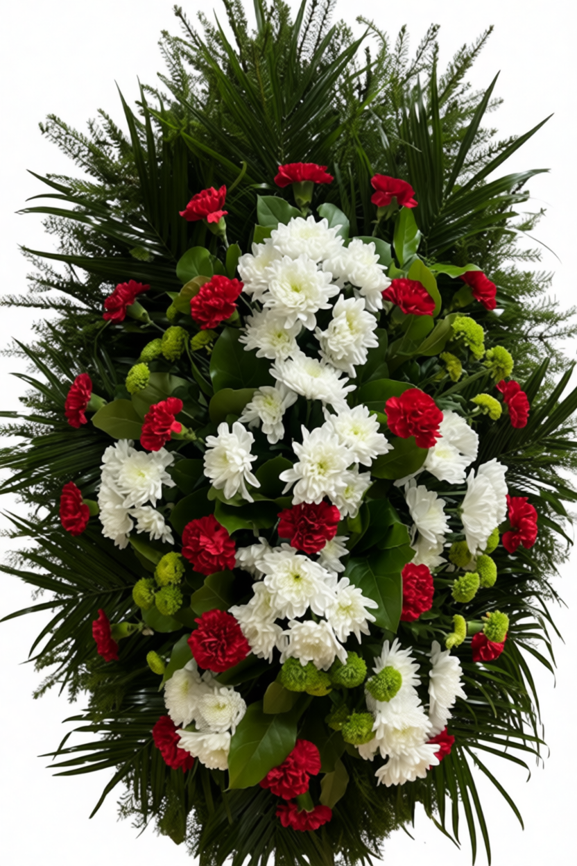 Этот траурный венок высотой 120 см представляет собой яркую и эмоционально выразительную композицию. Он составлен из насыщенных красных гвоздик, нежных белых хризантем и необычных зелёных кустовых хризантем, что создаёт трогательное сочетание цветов и смыслов.