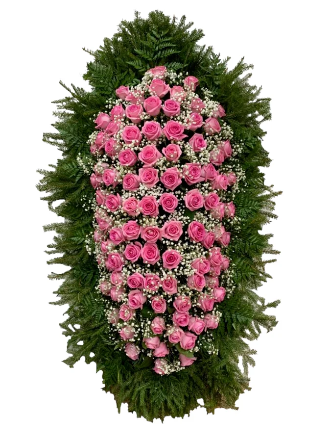 Этот трогательный траурный венок высотой 150 см — дань светлой памяти и выражение нежности и любви. Он создан из розовых роз и воздушной гипсофилы, что делает его особенно изысканным и эмоционально выразительным.