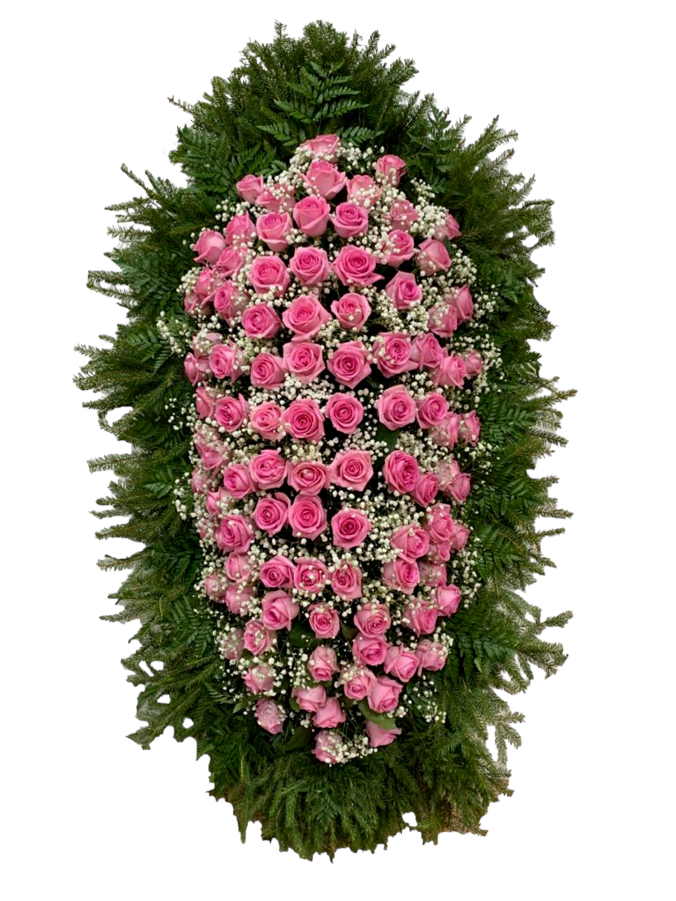 Розовые розы напоминают о теплоте чувств и безусловной любви, а гипсофила придаёт легкости и надежды. Зелёная основа подчёркивает естественность и вечную связь с природой, создавая образ скорби, наполненный светом и уважением к памяти усопшего.
