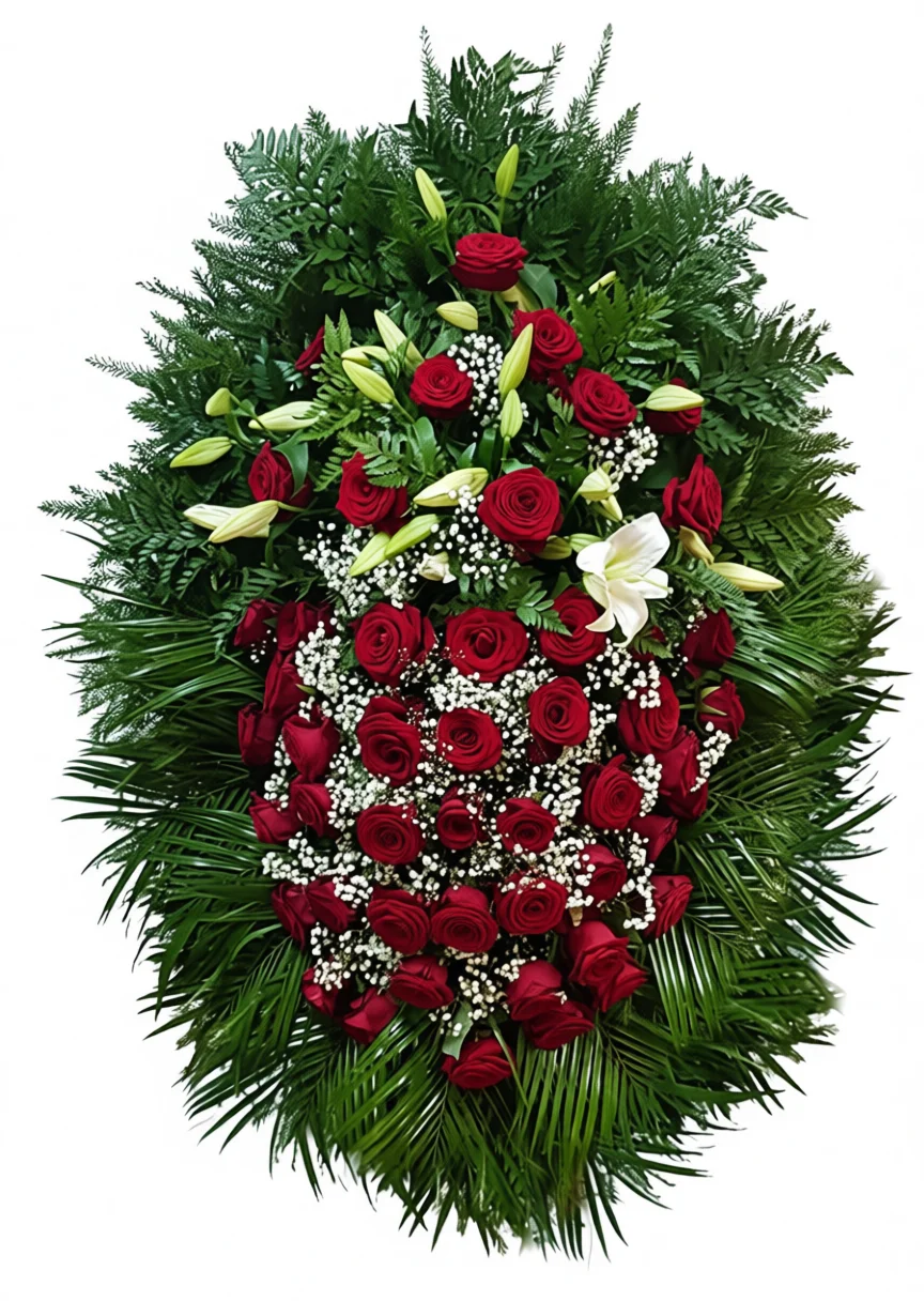 Розы аккуратно дополнены нежными лилиями, которые добавляют образу воздушности и изысканности. Это сочетание подчёркивает важность момента прощания и передаёт светлую память о близком человеке.
