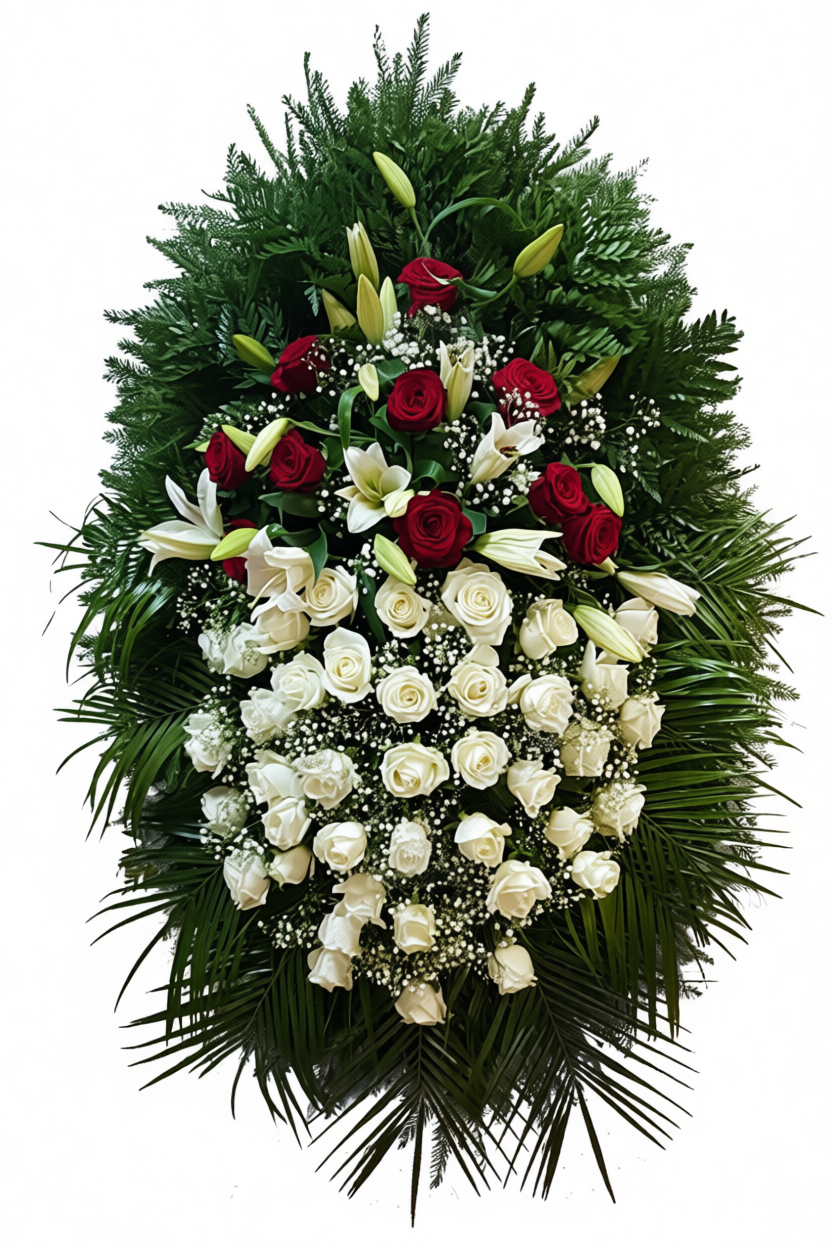 Этот элегантный траурный венок высотой 150 см составлен из ярких красных роз и нежной гипсофилы. Он создан как выражение глубокой скорби, любви и вечной памяти — идеальный выбор для церемонии прощания с близким человеком.