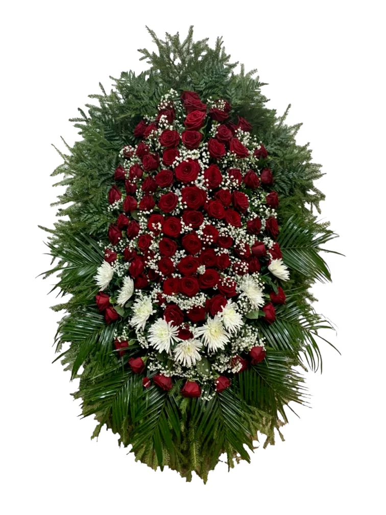 Этот великолепный траурный венок высотой 150 см — сочетание роскошных красных роз, белых хризантем и нежной гипсофилы. Он создан как символ глубокой скорби, уважения и светлой памяти об усопшем. Его насыщенные цвета и изысканная композиция делают его достойным акцентом на церемонии прощания.