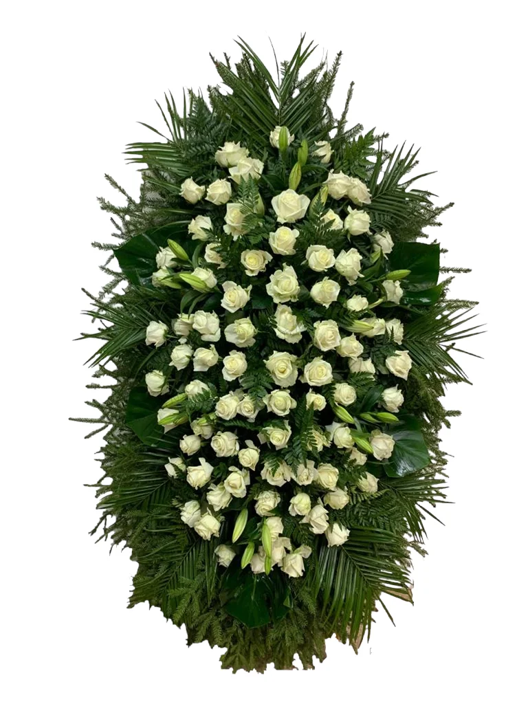Этот изысканный траурный венок высотой 150 см создан из белых роз и лилий — цветов, олицетворяющих чистоту помыслов, светлую память и уважение к усопшему. Его строгий и торжественный дизайн делает его идеальным выбором для прощальной церемонии.