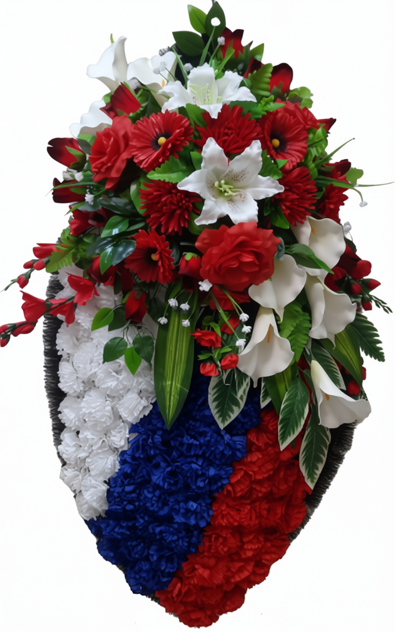 Композиция сочетает в себе государственную символику (триколор) и глубокие цветочные значения: лилии — возрождение и духовность, герберы — благодарность и уважение, розы — любовь и память. Это выражение глубокого уважения к памяти героя, воина или выдающегося гражданина России.