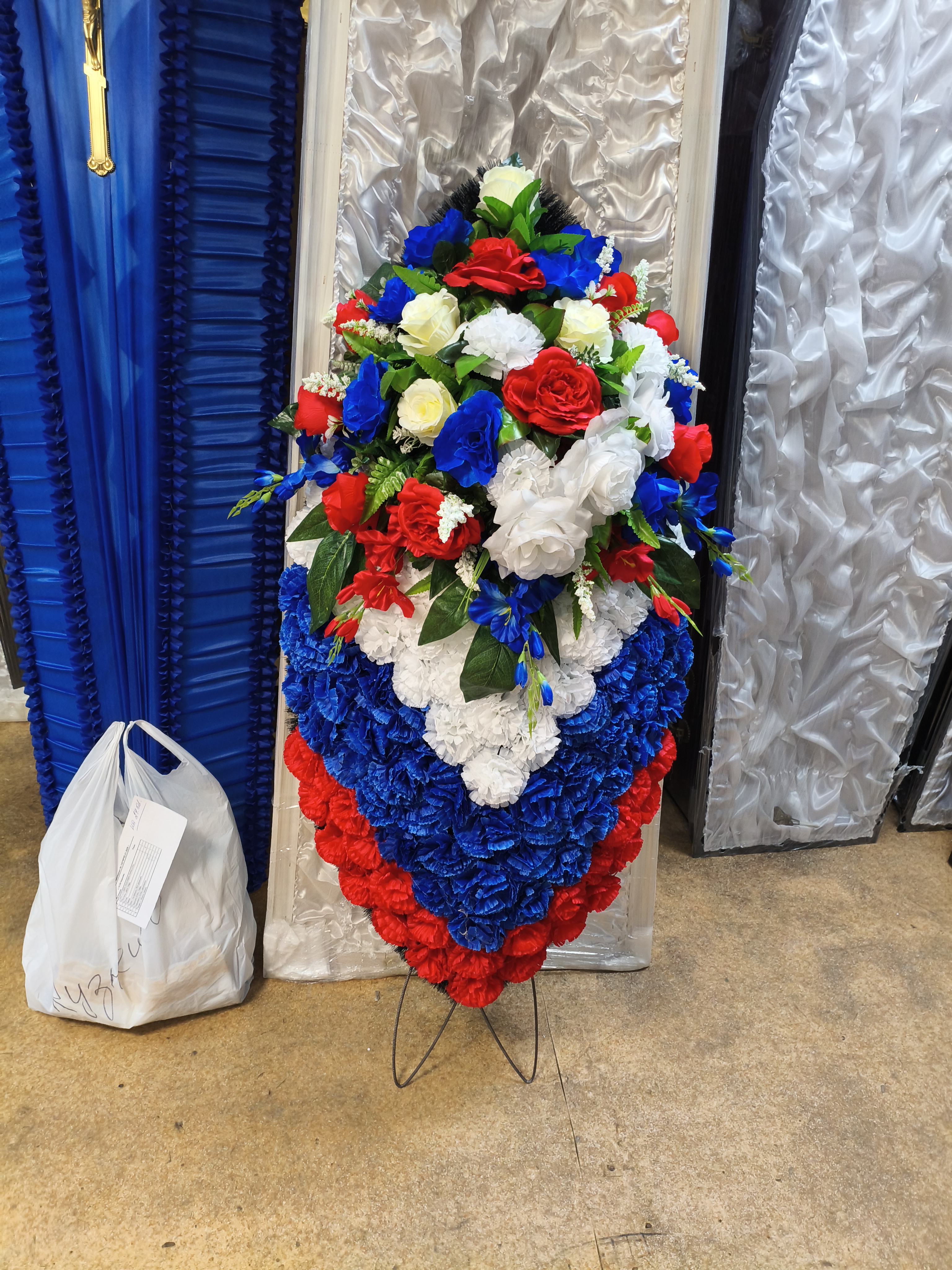 - Верхняя часть: живописная композиция из крупных красных, белых и синих роз, дополненная мелкими белыми цветами и зеленью — создаёт эффект объёма и торжественности.