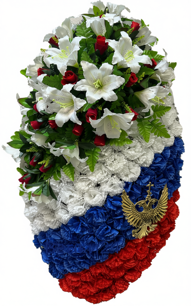 Торжественная и глубоко символичная композиция, выполненная в виде государственного флага Российской Федерации. Идеально подходит для похорон, памятных церемоний и возложения к мемориалам.